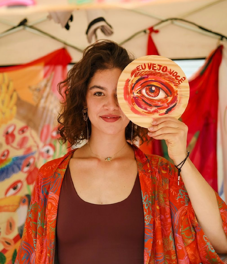 Her artistic universe draws from Brazilian references, everyday scenes, and symbolic elements, often influenced by her background in Psychology. Her practice is grounded in the idea that art is a way of seeing the world, translating reflections, an appreciation for nature, and aspects of Brazilian culture into visual compositions.