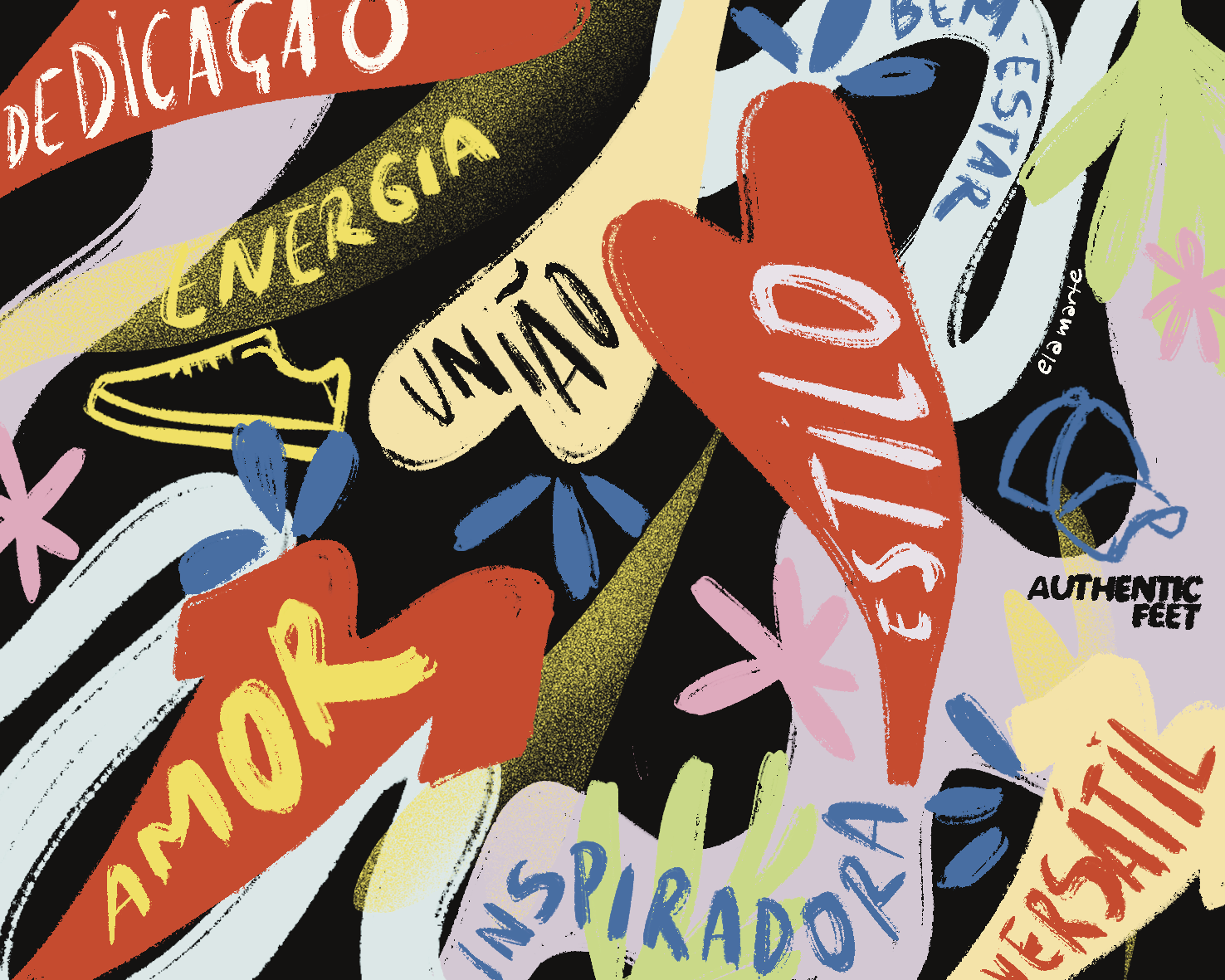 This campaign idea was to create an art that trasmited the Authentic Feet identity while celebrating mother´s day without being cliche. Teh result was a colorful and dinamic art, with some words of empowerment and "easter eggs" of the brand's concept.