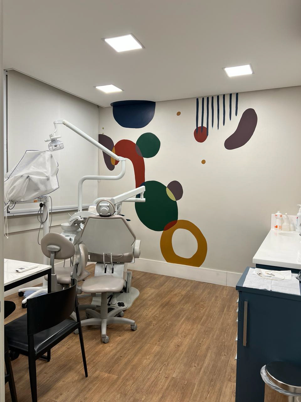 Wall art for two rooms in a dental office. The rooms attend both adults and children, so the briefing was that the art was fun without being infant. The result were these colorful, playful and abstract murals.