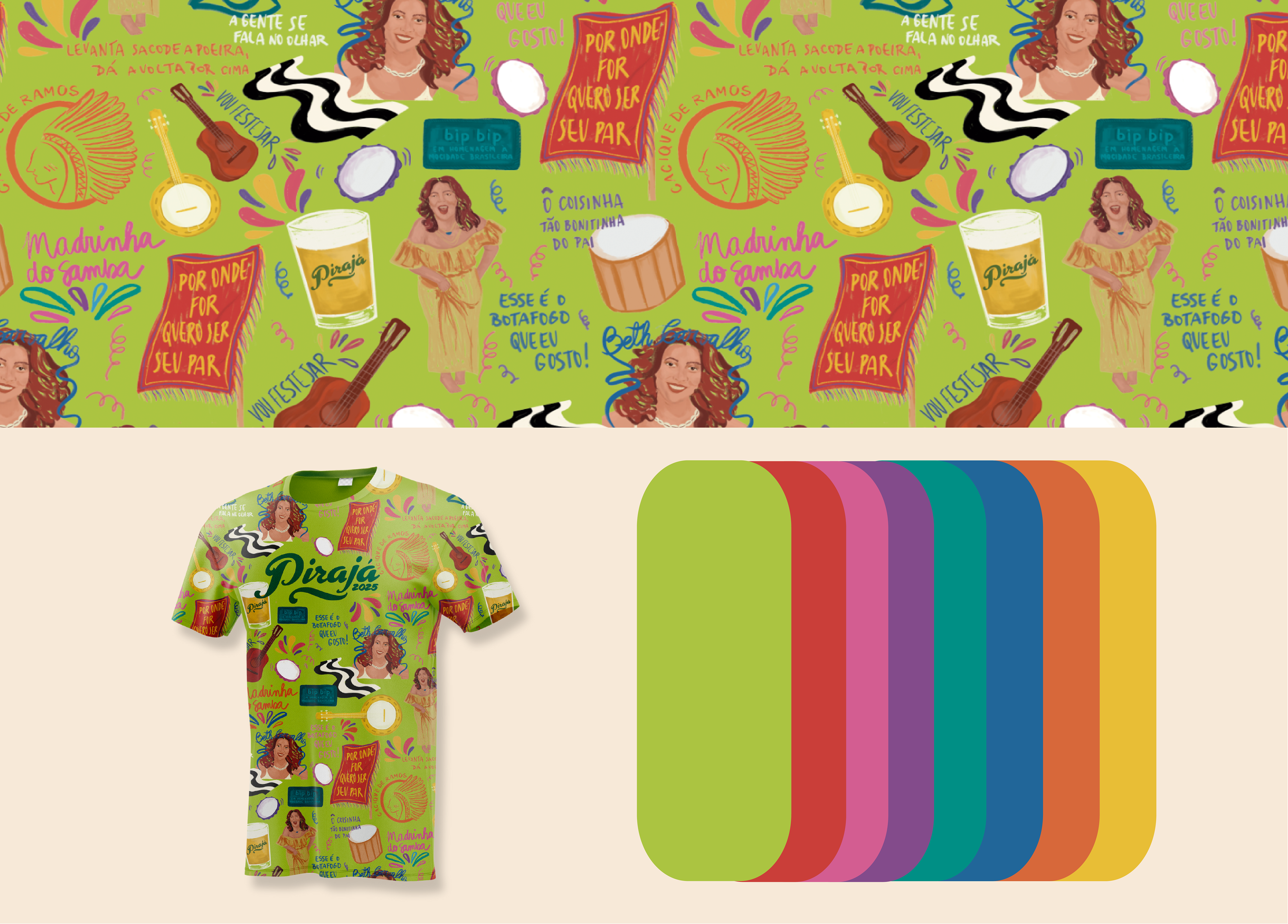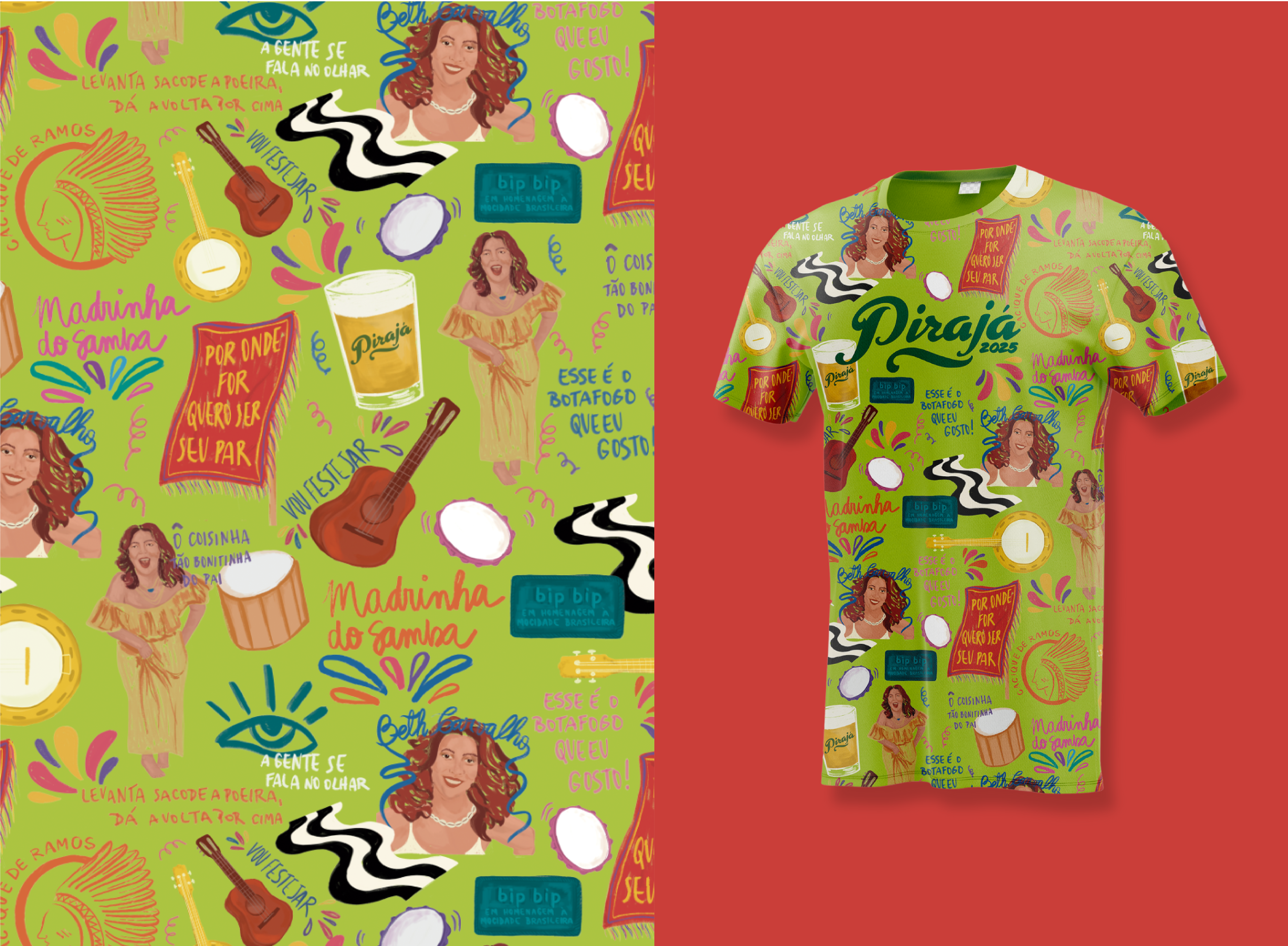 [PT] O tradicional bar paulista Pirajá me convidou para criar a ilustração do abadá do evento Grito de Carnaval 2025. A proposta era fazer uma homenagem à “Madrinha do Samba” Beth Carvalho e à sua cidade, e também inspiração da identidade do bar, o Rio de Janeiro.