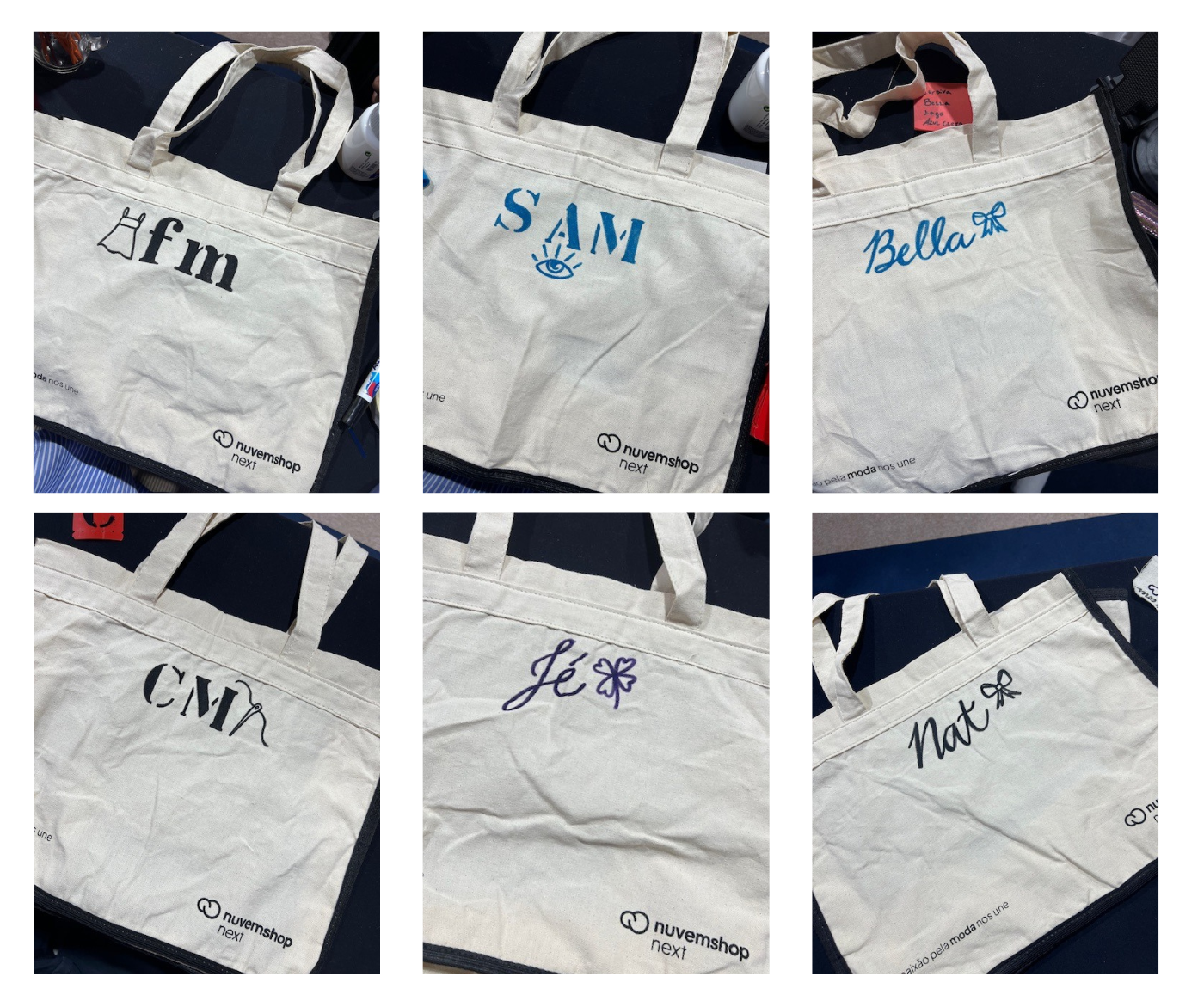[PT] A convite da Nuvemshop, desenvolvi uma ativação de personalização ao vivo durante o Salão CasaModa, onde sacolas foram customizadas manualmente com as iniciais dos convidados. A ação propôs uma interação direta entre público e obra, transformando cada peça em um objeto único.