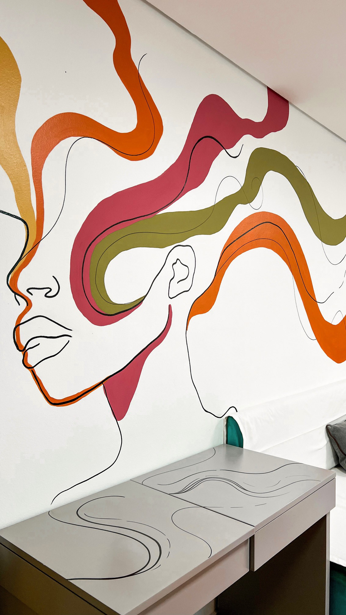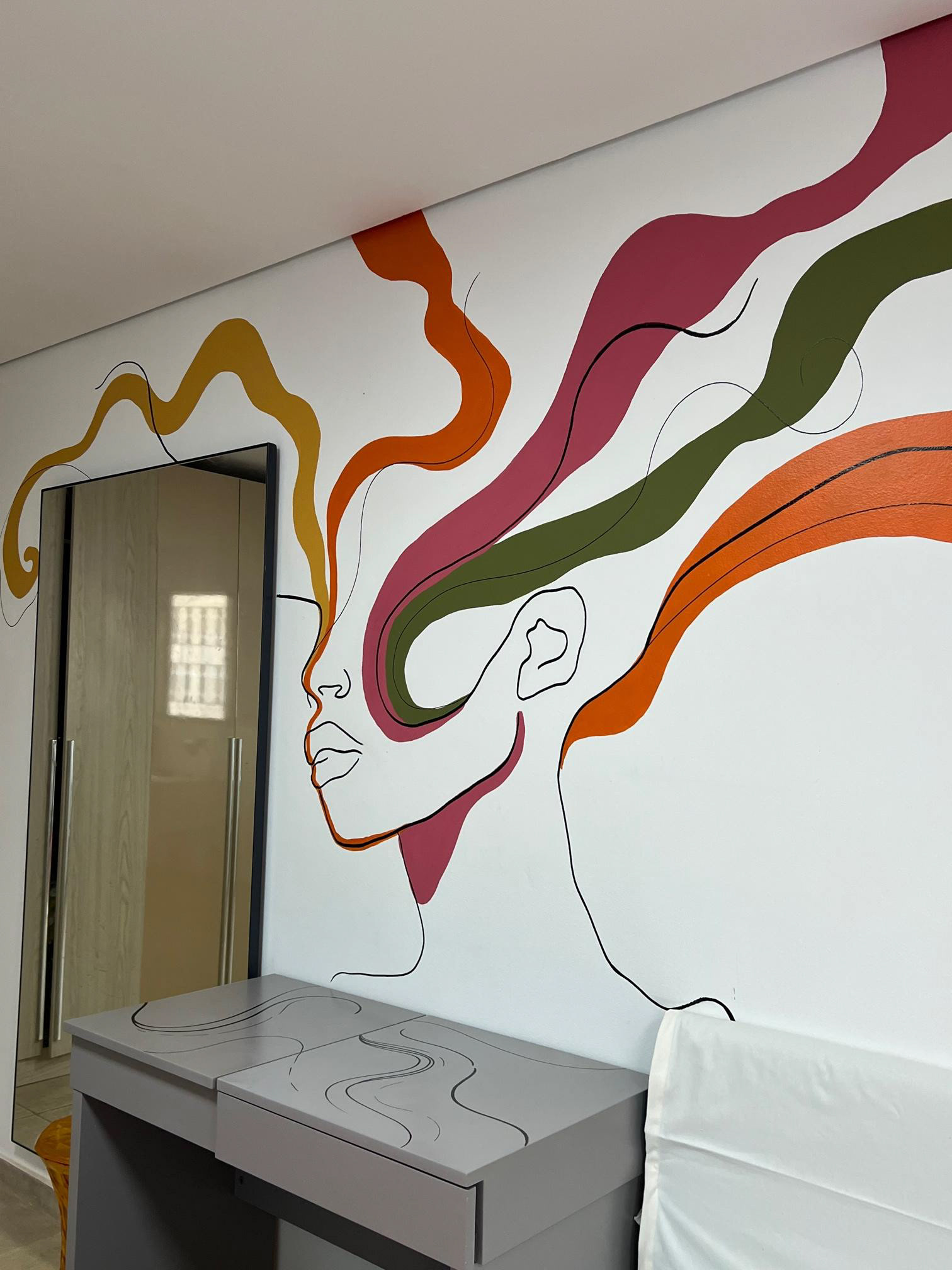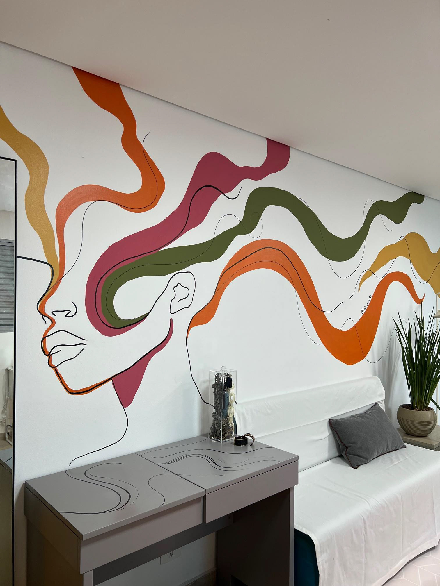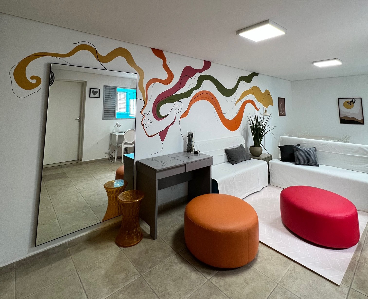 I created and painted an art on the wall of the living room and free use of a republic that welcomes 6 women aged 18 to 21 years. The professional responsible for decorating the environment was the interior designer Marília Caetano. The room was completely transformed and gained a new life, with more personality and inspiration. Wall art played a strong role in this transformation, which had little time and resources available to carry out.