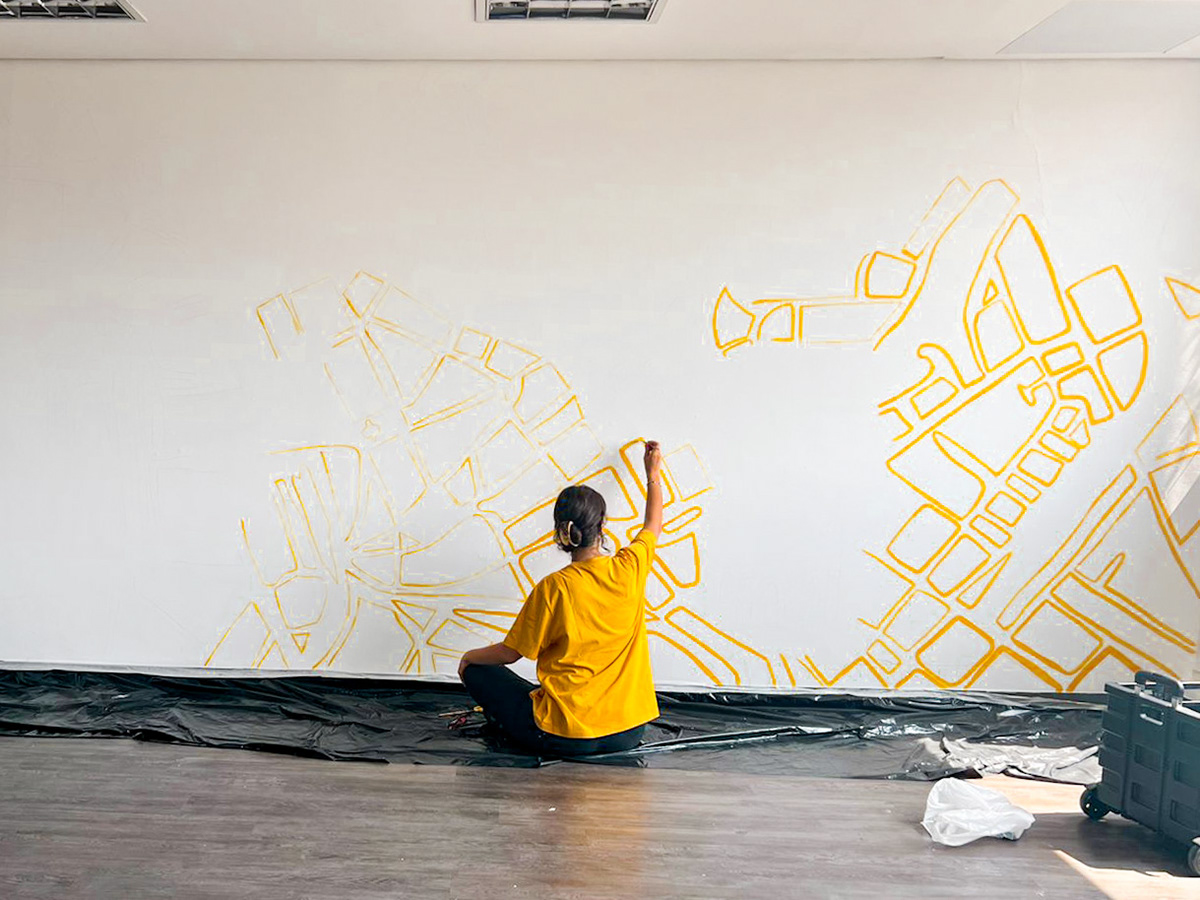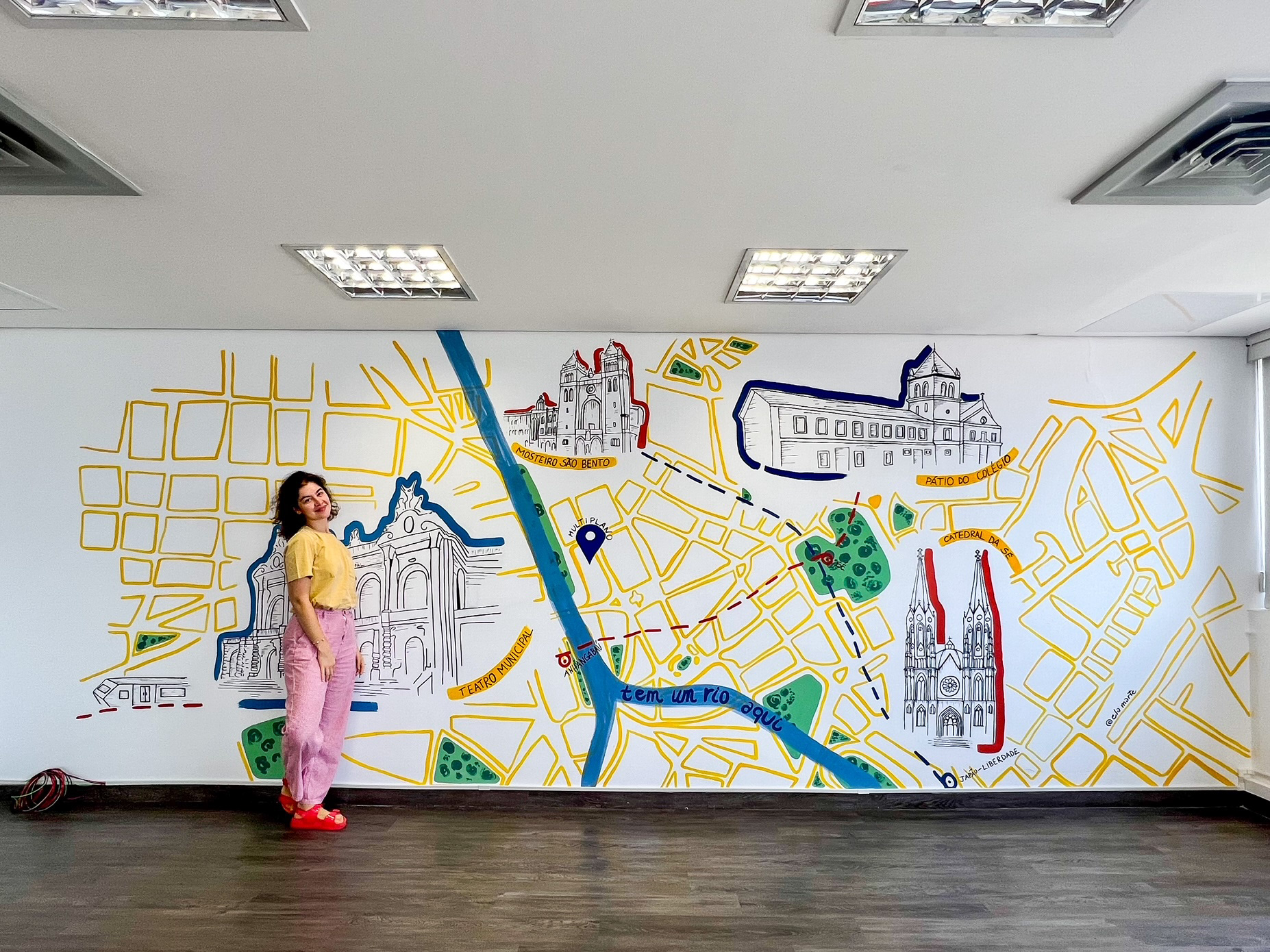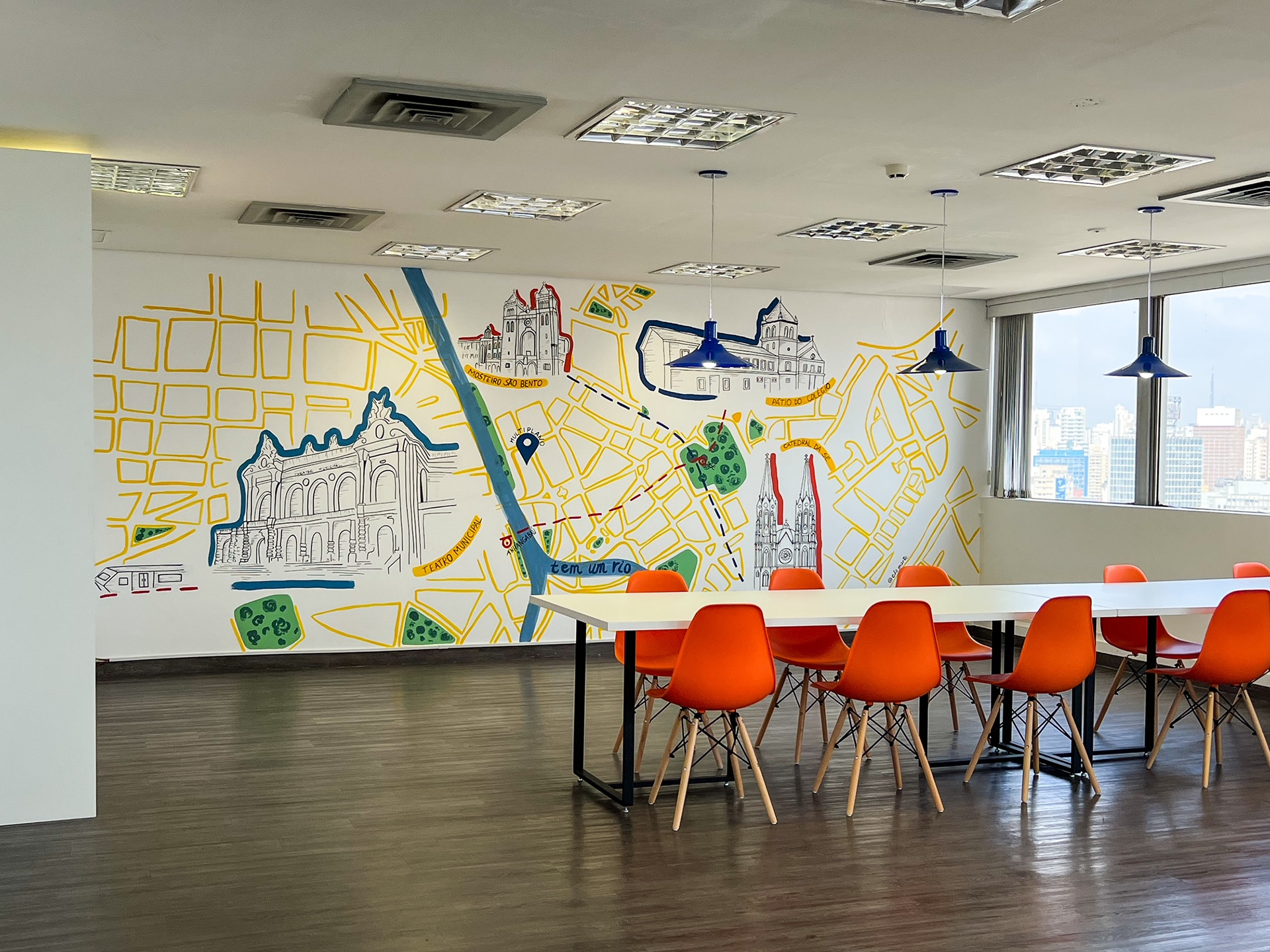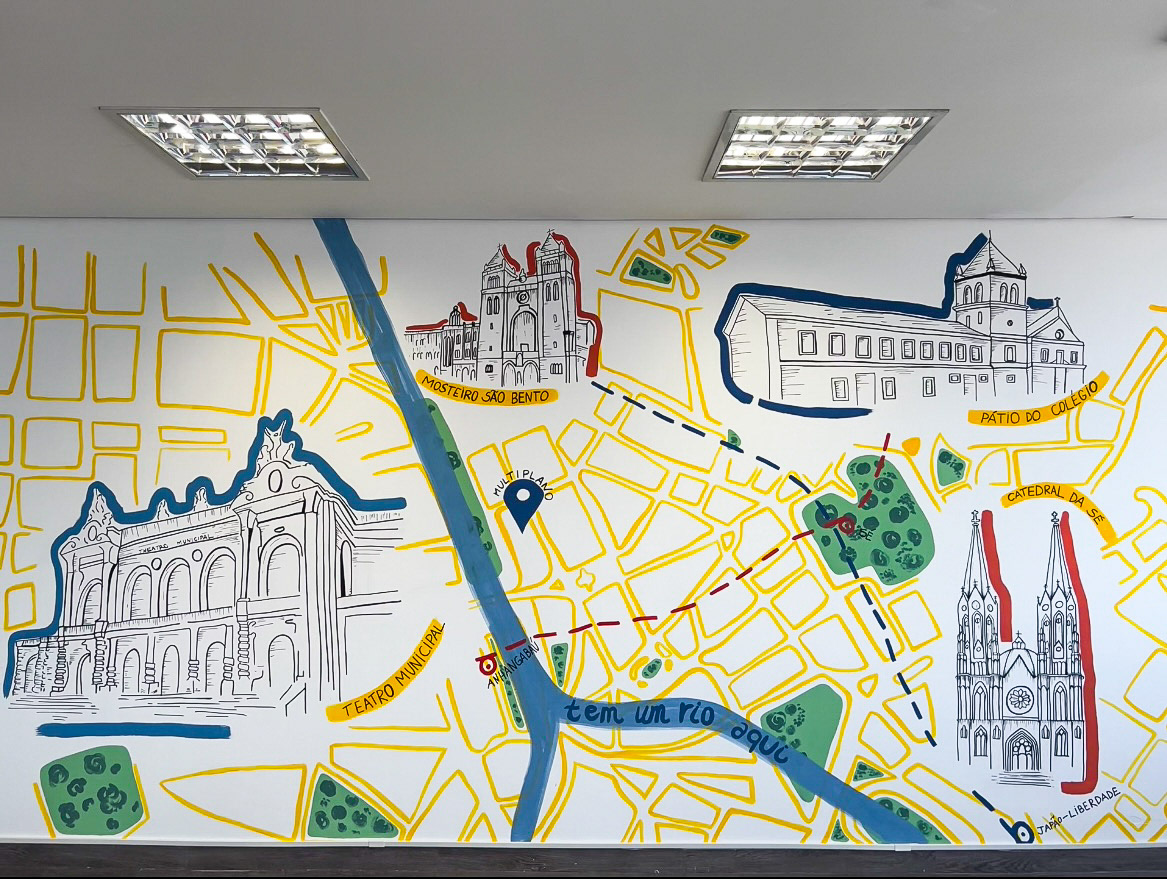 Wall art for the decompression room of an engineering company. The idea was to bring the company's architectural roots through the historic buildings in the center of São Paulo all combined in a map where the office is located.The company's colors were incorporated in the art's color pallete.